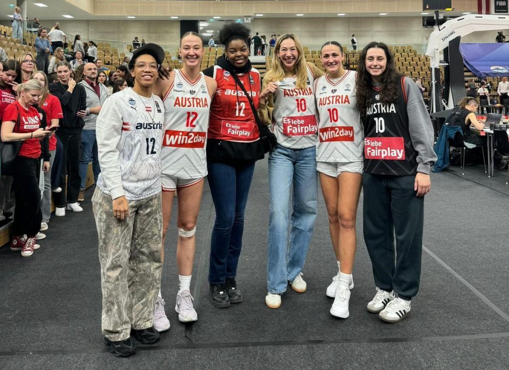 Schlachtenbummlerinnen: Liz Smith, Khalis Cain, Sona Svetlikova und Katie Shumate unterstützten Anna Alborova und Alexia Allesch beim EM-Qualifikationsspiel gegen Norwegen in der Wiener Sport Arena. Fotos: FIBA Basketball, privat.