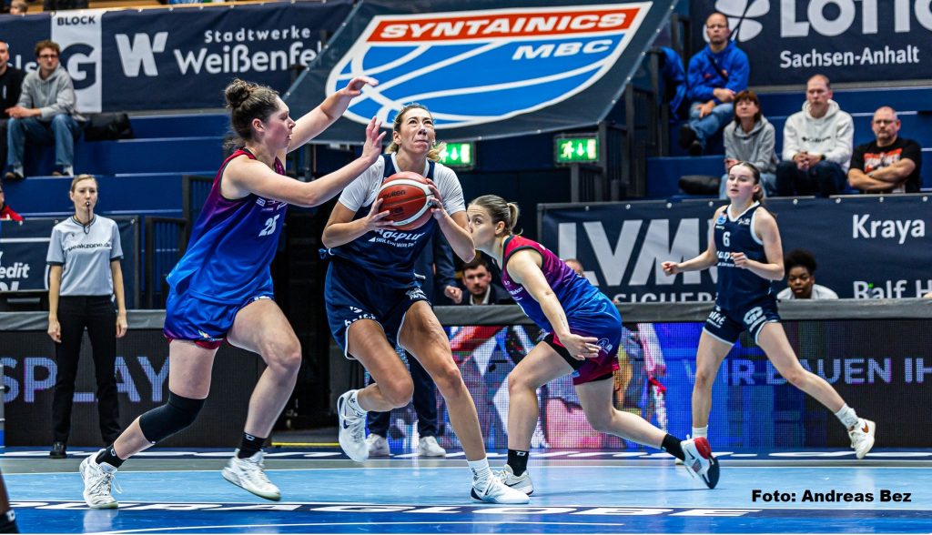 Dyn wird die Partie des 9. Spieltages der Toyota DBBL live auf seinem Youtube-Kanal übertragen. Die zuletzt gegen Nördlingen mit 13 Punkten, 5 Rebounds und 4 Steals auftrumpfende Sona Svetlikova (Foto oben am Ball) gastiert an ihrer ehemaligen Wirkungsstätte (Saison 2023/24). Die Hallenserinnen möchten den zweiten Sieg in Folge einfahren, was ihnen zuletzt im Februar dieses Jahres gelungen ist. Der letzte Erfolg in Herne datiert vom 18. Oktober 2023: Nach einem 15-Punkte-Rückstand im dritten Viertel gewannen sie am Ende noch 69:68. „Wir wollen unsere aufsteigende Form der vergangenen Wochen bestätigen“, gibt Timur Topal als Marschroute vor. „Dafür müssen wir besser ins Spiel starten als bisher und noch konstanter über die kompletten 40 Minuten auftreten.“
