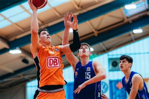 Sean William Ludwig (#8 MBA), Tim Herzog (#15 ERF – Basketball Löwen) waehrend der Saison 2021-22 in der NBBL Herren zwischen Mitteldeutsche Basketball Academy und Erfurt Basketball Löwen in der Ballsporthalle Sandersdorf am 18. December 2021 in Sandersdorf, Sachsen Anhalt, Deutschland