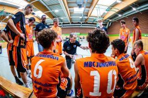 Trainer Marcus Brambora (MBA) mit Team in der Auszeit waehrend der Saison 2020-2021 in der JBBL-Begegnung zwischen MBA – Mitteldeutsche Basketball Academy und Bayreuth TYH TenneT young heroeos in der Sporthalle Sandersdorf am 17. October 2020 in Sandersdorf, Sachsen Anhalt, Deutschland