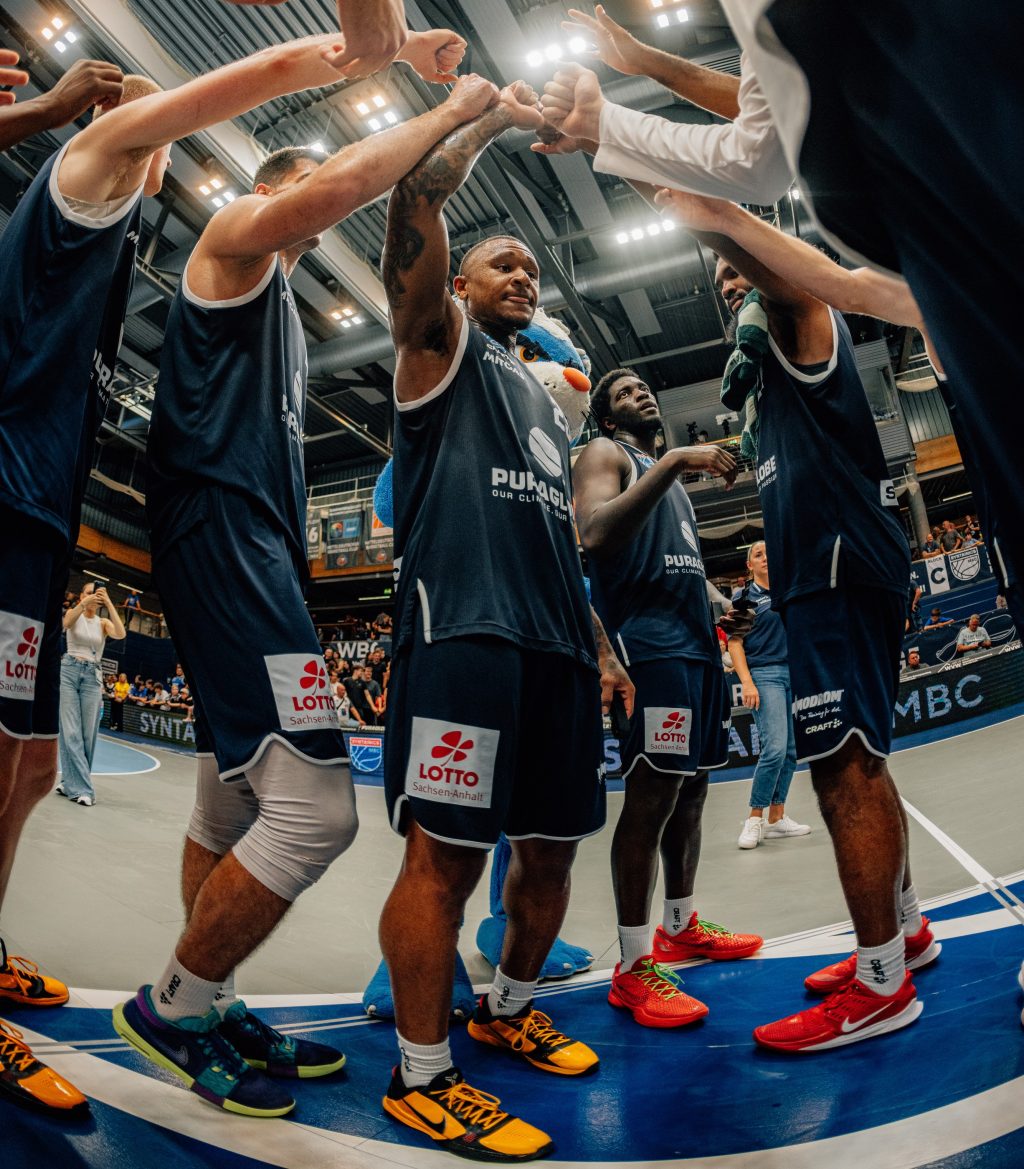 Bei der Generalprobe vor 1200 Zuschauern in der neuerdings in navyblau gebrandeten Stadthalle Weißenfels war Spencer Reaves (Foto oben am Ball) bester Scorer (19 Punkte) und bester Rebounder (6) des Teams. Zweistellig punkteten zudem Charles Callison (15), Khyri Thomas (14) und Collin Welp (12). Bazoumana Koné fehlte wegen Kniebeschwerden.