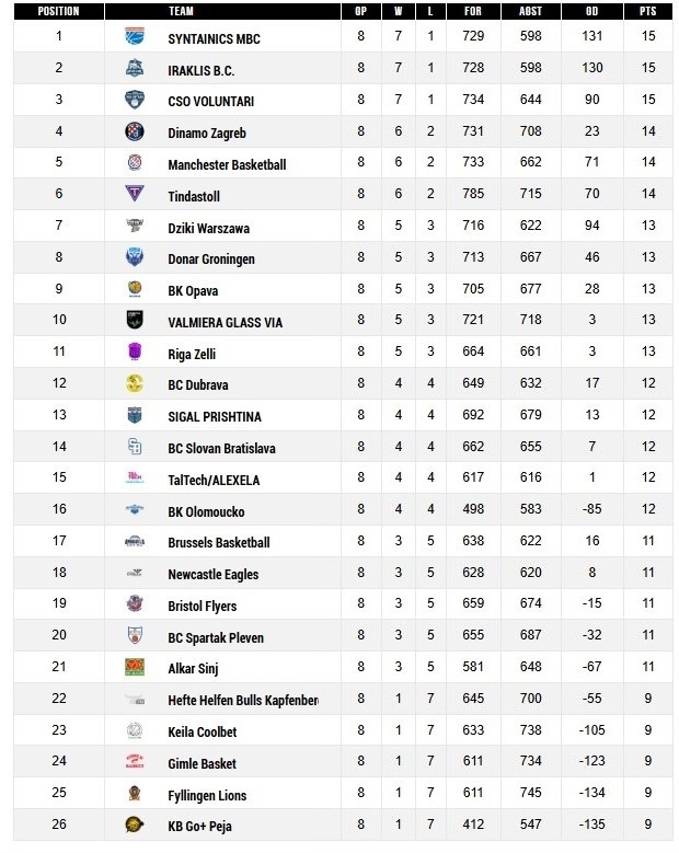 Das Achtelfinale wird in nur einem Spiel beim besser platzierten Team ausgetragen. Die Wölfe empfangen am Mittwoch, 11. März, den tschechischen Erstligisten BK Olomoucko aus Olmütz in der Stadthalle Weißenfels. Bei einem Sieg träfen sie im Viertelfinale – dann in Hin- und Rückspiel – auf den Gewinner der Begegnung zwischen dem niederländischen Traditionsclub Donar Groningen und BK Opava, ebenfalls Tschechien. Das Heimspiel würde am 24. oder 25. März stattfinden. Im Abschlussklassement entschied ein einziger Punkt zugunsten der Wölfe: Mit insgesamt 729 erzielten Zählern lagen sie hauchdünn vor dem punktgleichen Zweiten Iraklis Saloniki (728). CSO VOLUNTARI beendete die Hauptrunde als Dritter.